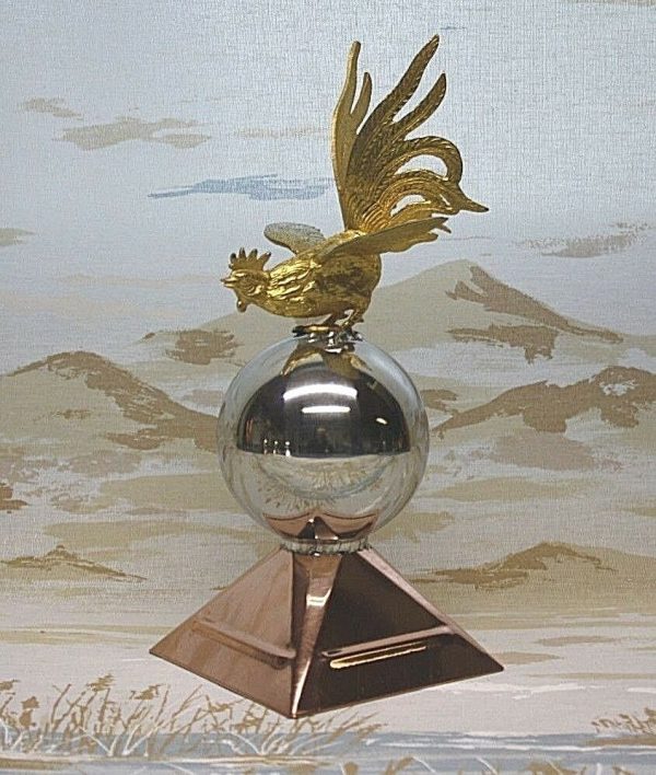 Gebe hier eine ganz prima kleine Dachspitze aus Kupferblech ab. Die Dachspitze „Herta“ ist mit ihren quadratischen Sockel und der geringen Größe bestens für die Montage auf einem kleinen Pavillon oder Brunnendach mit max 45° Dachneigung geeignet und besticht vor allem durch den kampfbereiten kleinen Hahn aus Messing, der sich auf der Kugel in Position gebracht zu haben scheint.