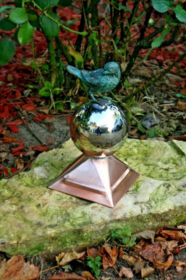 Gebe hier eine ganz „süße“ kleine Dachspitze aus Kupferblech ab. Die Dachspitze „Ljuba“ ist mit ihren quadratischen Sockel und der geringen Größe bestens für die Montage auf einem kleinen Pavillon oder Brunnendach geeignet und besticht vor allem durch den lebensgroßen Spatz aus Bronze, der sich soeben auf der Kugel niedergelassen zu haben scheint, um sich sein Gefieder zu putzen.