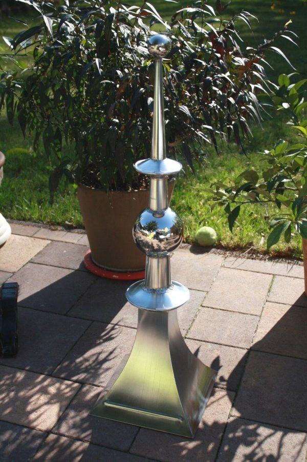 Biete mit „Magdalena“ eine wunderschöne handwerklich gefertigte Firstspitze aus Zinkblech, welche sich zur Montage auf einem Firstziegel „Braas Sattelfirst HO“ eignet (Bilder 3 und 4), aber von mir auf Wunsch auch für jeden anderen Firsten passend hergestellt werden kann. Der perfekte Dachschmuck für Ihr Heim, und das zu einem echt Prima Preis. Für die Montage von „Magdalena“ benötigt man keine besondere Ausbildung, denn sie wird ganz einfach auf den Firstziegel geschraubt und dieser dann wie gewohnt montiert (das können Sie aber Ihrem Dachdecker überlassen ;-). Die Verwendung ausnahmslos hochwertiger Materialien, die klassische Form und eine solide handwerkliche Verarbeitung lassen die Firstspitze „Magdalena“ zu einer wahren Bereicherung des Bauwerkes werden, auf dessen Dach sie ihre Heimat findet. Auf Wunsch und gegen den geringen Aufpreis von 40,- Euro kann diese Spitze mit einer 24 Karat Vergoldung auf der großen Kugel geliefert werden und für nur 50,- Euro zusätzlich bekommt ihr das Teil mit beiden Kugeln vergoldet (Lieferzeit dann ca. 3 Tage).